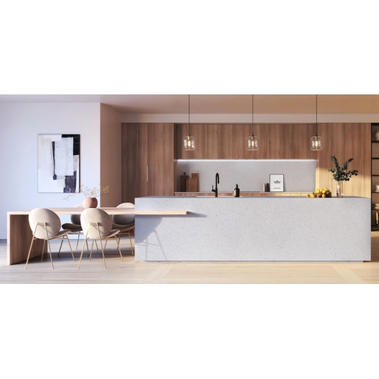 1001 스파클 화이트 쿼츠 은은하게 빛나는 미네랄 입자가 섬세하게 어우러진 밝은 흰색 바탕에 깨끗하고 윤기 있는 외관을 자랑합니다. 표면은 은은한 반짝임으로 빛을 반사하며 모든 각도에서 깊이감과 세련미를 더해 우아함을 발산합니다. 깔끔하고 세련된 디자인으로 어떤 공간에도 품격을 더하는 이 쿼츠는 모던한 조리대, 세면대, 포인트 표면 등에 완벽하게 어울립니다.
