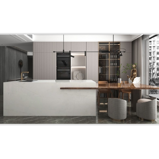 5006 칼라카타 에메랄드 쿼츠는 대담한 화이트 바탕에 짙은 에메랄드 그린 색상의 줄무늬가 드라마틱하게 어우러진 것이 특징입니다. 이러한 강렬한 대비는 시각적으로 깊이 있고 역동적인 에너지를 선사합니다. 이 슬래브는 고급스러운 모던함을 구현하여 어떤 현대적인 디자인에도 강렬한 존재감을 드러내고 공간에 생동감 넘치는 세련미를 불어넣습니다.