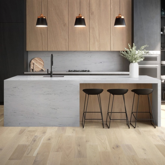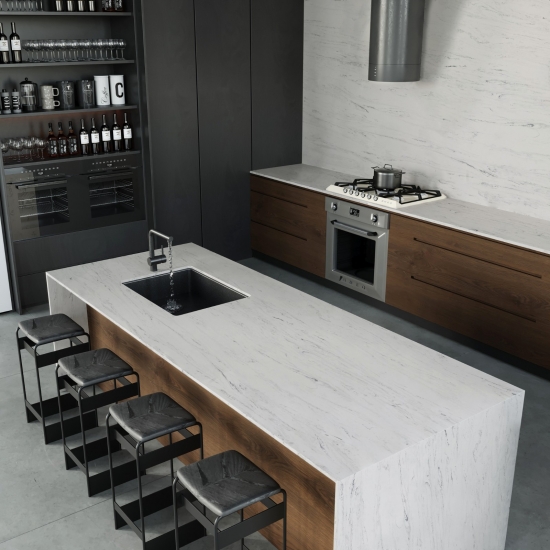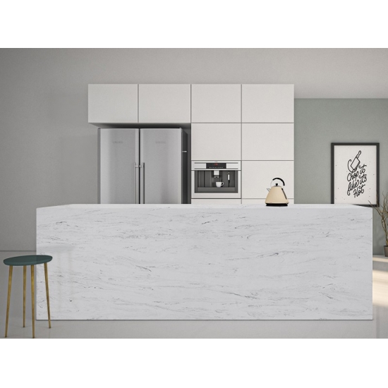 정교하고 독특한 칼라카타 쿼츠는 깨끗한 흰색과 눈길을 사로잡는 대리석 무늬의 줄무늬로 감각을 매료시킵니다. 아름답고 강렬한 넓은 줄무늬 패턴과 고급스러운 촉감을 자랑하는 이 쿼츠는 칼라카타 대리석의 자연스러운 외관을 그대로 재현하면서도 대리석 상판의 단점을 모두 해결했습니다. 칼라카타 쿼츠는 내구성이 매우 뛰어나 얼룩과 긁힘에 강하기 때문에 주방 및 욕실 조리대, 계단, 창틀, 맞춤 가구, 내외부 벽면 및 바닥재, 워터젯 패턴 등 다양한 디자인 프로젝트에 실용적인 선택입니다.