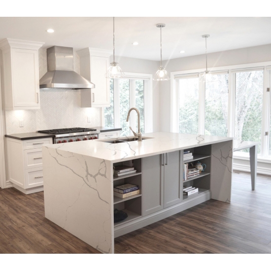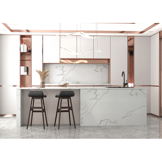 칼라카타 시리즈 쿼츠는 현재 가장 인기 있는 쿼츠 스톤 제품입니다. 정교하고 독특한 칼라카타 쿼츠는 깨끗한 흰색과 대리석 무늬가 돋보이는 아름다운 패턴으로 감각을 사로잡습니다. 고급스러운 질감과 눈길을 사로잡는 넓은 무늬를 자랑하는 이 쿼츠는 칼라카타 대리석의 자연스러운 외관을 그대로 재현하면서도 대리석 상판의 단점을 모두 해결했습니다. 칼라카타 쿼츠는 내구성이 매우 뛰어나 얼룩과 긁힘에 강하기 때문에 주방 및 욕실 조리대, 계단, 창틀, 맞춤 가구, 실내외 벽면 및 바닥재, 워터젯 패턴 등 다양한 디자인 프로젝트에 실용적인 선택입니다.