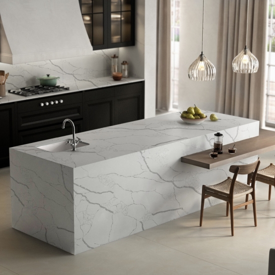 칼라카타 시리즈 쿼츠는 현재 가장 인기 있는 쿼츠 스톤 제품입니다. 정교하고 독특한 칼라카타 쿼츠는 깨끗한 흰색과 대리석 무늬가 돋보이는 아름다운 패턴으로 감각을 사로잡습니다. 고급스러운 질감과 눈길을 사로잡는 넓은 무늬를 자랑하는 이 쿼츠는 칼라카타 대리석의 자연스러운 외관을 그대로 재현하면서도 대리석 상판의 단점을 모두 해결했습니다. 칼라카타 쿼츠는 내구성이 매우 뛰어나 얼룩과 긁힘에 강하기 때문에 주방 및 욕실 조리대, 계단, 창틀, 맞춤 가구, 실내외 벽면 및 바닥재, 워터젯 패턴 등 다양한 디자인 프로젝트에 실용적인 선택입니다.