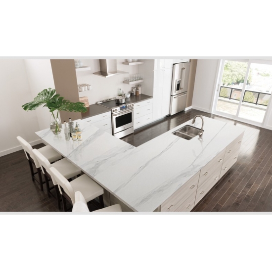 5044 볼라카스 쿼츠 슬랩은 순수하고 빛나는 흰색 바탕에 부드럽고 섬세한 회색 줄무늬가 아름답게 어우러져 있습니다. 은은하게 흐르는 듯한 패턴은 고요한 우아함과 시대를 초월하는 매력을 선사합니다. 이 슬랩은 클래식한 아름다움과 현대적인 내구성을 완벽하게 조화시켜 어떤 인테리어 공간에도 밝고 고급스러운 분위기를 손쉽게 더해줍니다.