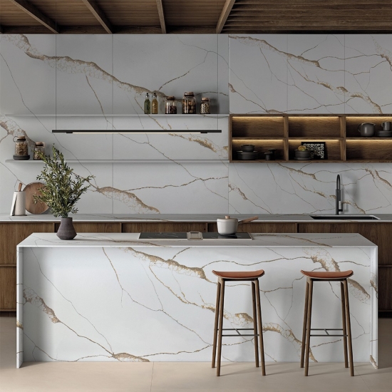 칼라카타 쿼츠 브리타니카 골드는 현재 가장 인기 있는 쿼츠 스톤 제품입니다. 정교하고 독특한 칼라카타 쿼츠는 깨끗한 흰색과 눈길을 사로잡는 대리석 무늬의 줄무늬로 감각을 매료시킵니다.