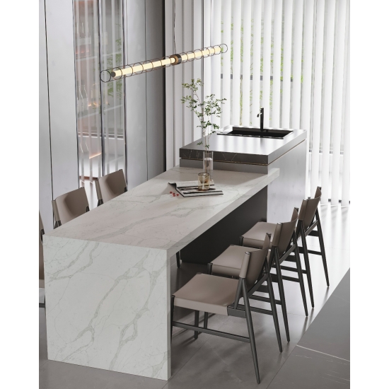 5063 베로나 칼라카타 쿼츠는 실리카 함량이 0%인 쿼츠 소재로, 특히 주방과 욕실 표면에 더욱 건강하고 지속 가능한 선택지를 제공합니다. 실리카가 함유되지 않아 시공이 안전하며, 실리카 먼지 노출로 인한 건강 위험을 줄여줍니다. 우아한 칼라카타 무늬는 고급스러운 대리석 느낌을 선사하며, 내구성이 뛰어난 비다공성 표면은 얼룩, 긁힘, 열에 강합니다. 따라서 아름다움, 안전성, 그리고 간편한 관리를 모두 갖춘 이 소재는 사용량이 많은 공간에 탁월한 선택입니다.