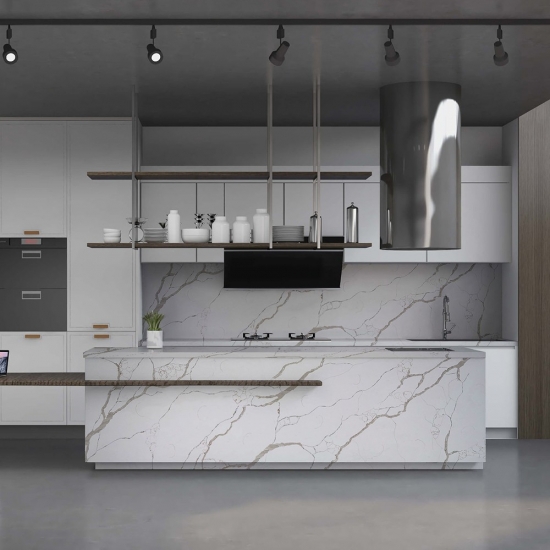 칼라카타 시리즈 쿼츠는 현재 가장 인기 있는 쿼츠 스톤 제품입니다. 정교하고 독특한 칼라카타 쿼츠는 깨끗한 흰색과 대리석 무늬가 돋보이는 아름다운 패턴으로 감각을 사로잡습니다. 고급스러운 질감과 눈길을 사로잡는 넓은 무늬를 자랑하는 이 쿼츠는 칼라카타 대리석의 자연스러운 외관을 그대로 재현하면서도 대리석 상판의 단점을 모두 해결했습니다. 칼라카타 쿼츠는 내구성이 매우 뛰어나 얼룩과 긁힘에 강하기 때문에 주방 및 욕실 조리대, 계단, 창틀, 맞춤 가구, 실내외 벽면 및 바닥재, 워터젯 패턴 등 다양한 디자인 프로젝트에 실용적인 선택입니다.