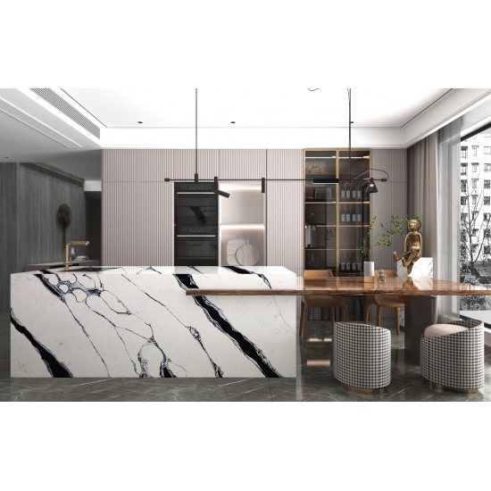5066 칼라카타 펜디 쿼츠 슬래브는 다양한 표면에 어울리는 우아하고 세련된 선택입니다. 이 슬래브는 눈부신 흰색 바탕에 회색과 금색의 강렬하고 드라마틱한 줄무늬가 특징입니다. 이 줄무늬 패턴은 천연 칼라카타 대리석의 클래식한 모습을 그대로 재현하면서도 쿼츠의 내구성과 손쉬운 관리라는 장점을 제공합니다.