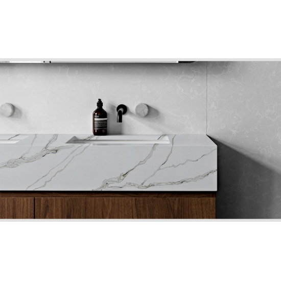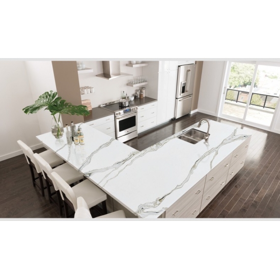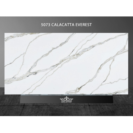 5073 칼라카타 에베레스트 쿼츠 슬랩은 강렬한 회색 줄무늬가 돋보이는 새하얀 바탕에 아름다운 색감을 선사합니다. 이러한 강렬한 대비는 역동적이면서도 고급스러운 시각적 효과를 연출합니다. 웅장하고 우아한 자태를 자랑하는 이 슬랩은 어떤 현대적인 인테리어에도 세련된 분위기를 더해줍니다.