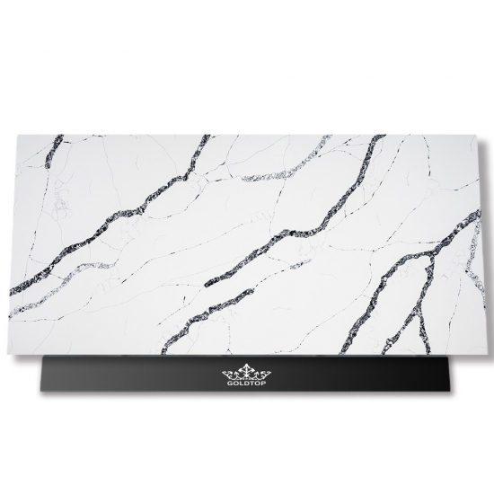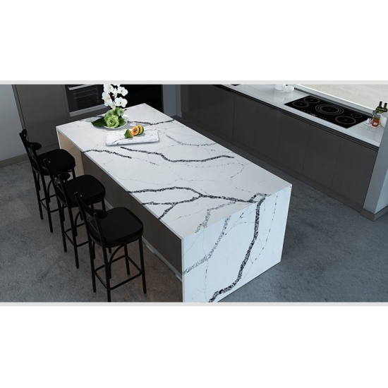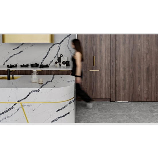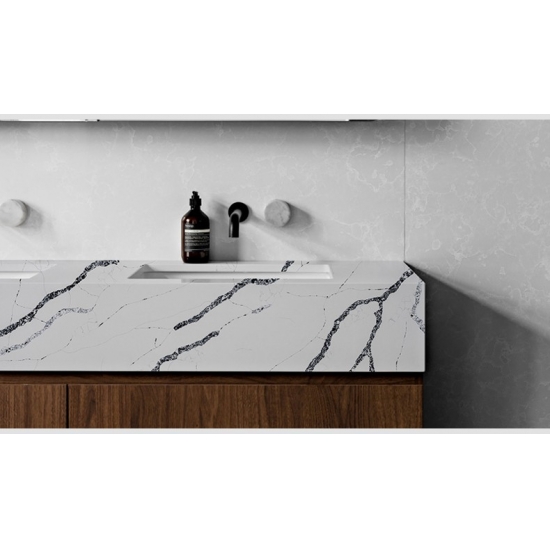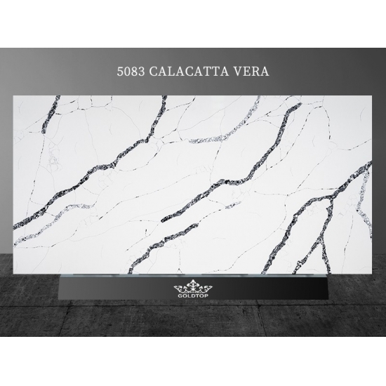 5083 칼라카타 베라 쿼츠는 밝은 흰색 바탕에 강렬하고 굵은 회색 줄무늬가 돋보이는 제품입니다. 이러한 극적인 대비는 깊이감과 역동적인 느낌을 자아냅니다. 고급스러운 우아함을 담은 이 슬래브는 어떤 현대적인 인테리어에도 세련된 분위기를 더하기에 이상적입니다.