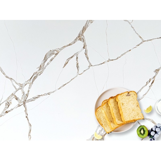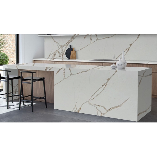 정교하고 독특한 칼라카타 쿼츠는 깨끗한 흰색과 눈길을 사로잡는 대리석 무늬의 줄무늬로 감각을 매료시킵니다. 아름답고 강렬한 넓은 줄무늬 패턴과 고급스러운 촉감을 자랑하는 이 쿼츠는 칼라카타 대리석의 자연스러운 외관을 그대로 재현하면서도 대리석 상판의 단점을 모두 해결했습니다. 칼라카타 쿼츠는 내구성이 매우 뛰어나 얼룩과 긁힘에 강하기 때문에 주방 및 욕실 조리대, 계단, 창틀, 맞춤 가구, 내외부 벽면 및 바닥재, 워터젯 패턴 등 다양한 디자인 프로젝트에 실용적인 선택입니다.