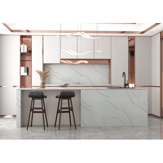 칼라카타 시리즈 쿼츠는 현재 가장 인기 있는 쿼츠 스톤 제품입니다. 정교하고 독특한 칼라카타 쿼츠는 깨끗한 흰색과 대리석 무늬가 돋보이는 아름다운 줄무늬로 감각을 사로잡습니다. 넓고 아름다운 줄무늬 패턴과 고급스러운 질감을 자랑하는 이 쿼츠는 칼라카타 대리석의 자연스러운 외관을 그대로 재현하면서도 대리석 상판의 단점을 모두 해결했습니다. 칼라카타 쿼츠는 내구성이 매우 뛰어나 얼룩과 긁힘에 강하기 때문에 주방 및 욕실 조리대, 계단, 창틀, 맞춤 가구, 실내외 벽면 및 바닥재, 워터젯 패턴 등 다양한 디자인 프로젝트에 실용적인 선택입니다.