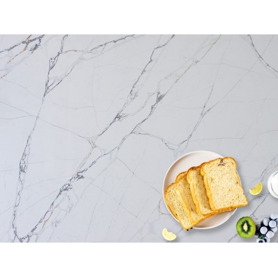 정교하고 독특한 칼라카타 쿼츠는 깨끗한 흰색과 눈길을 사로잡는 대리석 무늬의 줄무늬로 감각을 매료시킵니다. 아름답고 강렬한 넓은 줄무늬 패턴과 고급스러운 촉감을 자랑하는 이 쿼츠는 칼라카타 대리석의 자연스러운 외관을 그대로 재현하면서도 대리석 상판의 단점을 모두 해결했습니다. 칼라카타 쿼츠는 내구성이 매우 뛰어나 얼룩과 긁힘에 강하기 때문에 주방 및 욕실 조리대, 계단, 창틀, 맞춤 가구, 내외부 벽면 및 바닥재, 워터젯 패턴 등 다양한 디자인 프로젝트에 실용적인 선택입니다.