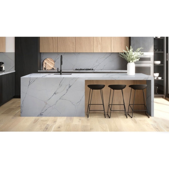 50 Square Meters정교하고 독특한 칼라카타 쿼츠는 깨끗한 흰색과 눈길을 사로잡는 대리석 무늬의 줄무늬로 감각을 매료시킵니다. 아름답고 강렬한 넓은 줄무늬 패턴과 고급스러운 촉감을 자랑하는 이 쿼츠는 칼라카타 대리석의 자연스러운 외관을 그대로 재현하면서도 대리석 상판의 단점을 모두 해결했습니다. 칼라카타 쿼츠는 내구성이 매우 뛰어나 얼룩과 긁힘에 강하기 때문에 주방 및 욕실 조리대, 계단, 창틀, 맞춤 가구, 내외부 벽면 및 바닥재, 워터젯 패턴 등 다양한 디자인 프로젝트에 실용적인 선택입니다.