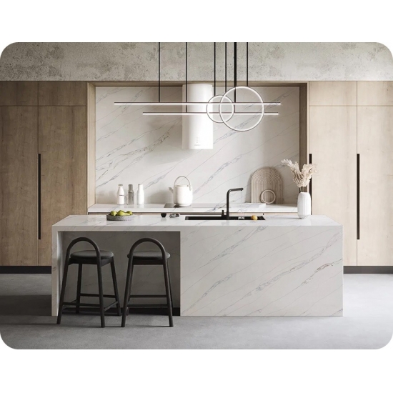 칼라카타 시리즈 쿼츠는 현재 가장 인기 있는 쿼츠 스톤 제품입니다. 정교하고 독특한 칼라카타 쿼츠는 깨끗한 흰색과 대리석 무늬가 돋보이는 아름다운 줄무늬로 감각을 사로잡습니다. 넓고 아름다운 줄무늬 패턴과 고급스러운 질감을 자랑하는 이 쿼츠는 칼라카타 대리석의 자연스러운 외관을 그대로 재현하면서도 대리석 상판의 단점을 모두 해결했습니다. 칼라카타 쿼츠는 내구성이 매우 뛰어나 얼룩과 긁힘에 강하기 때문에 주방 및 욕실 조리대, 계단, 창틀, 맞춤 가구, 실내외 벽면 및 바닥재, 워터젯 패턴 등 다양한 디자인 프로젝트에 실용적인 선택입니다.