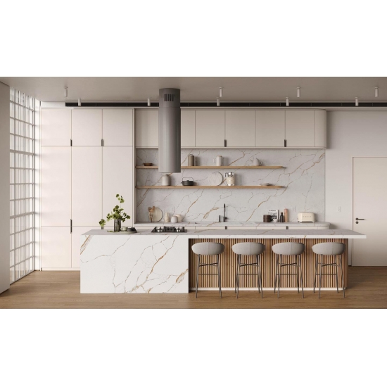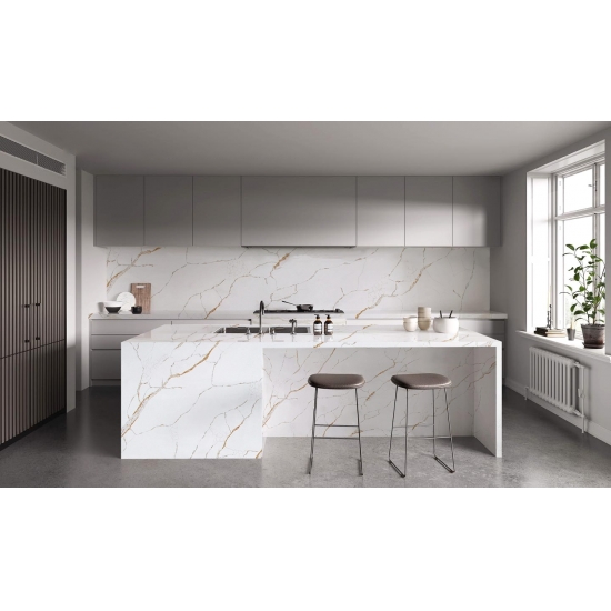 정교하고 독특한 칼라카타 쿼츠는 깨끗한 흰색과 눈길을 사로잡는 대리석 무늬의 줄무늬로 감각을 매료시킵니다. 아름답고 강렬한 넓은 줄무늬 패턴과 고급스러운 촉감을 자랑하는 이 쿼츠는 칼라카타 대리석의 자연스러운 외관을 그대로 재현하면서도 대리석 상판의 단점을 모두 해결했습니다. 칼라카타 쿼츠는 내구성이 매우 뛰어나 얼룩과 긁힘에 강하기 때문에 주방 및 욕실 조리대, 계단, 창틀, 맞춤 가구, 내외부 벽면 및 바닥재, 워터젯 패턴 등 다양한 디자인 프로젝트에 실용적인 선택입니다.