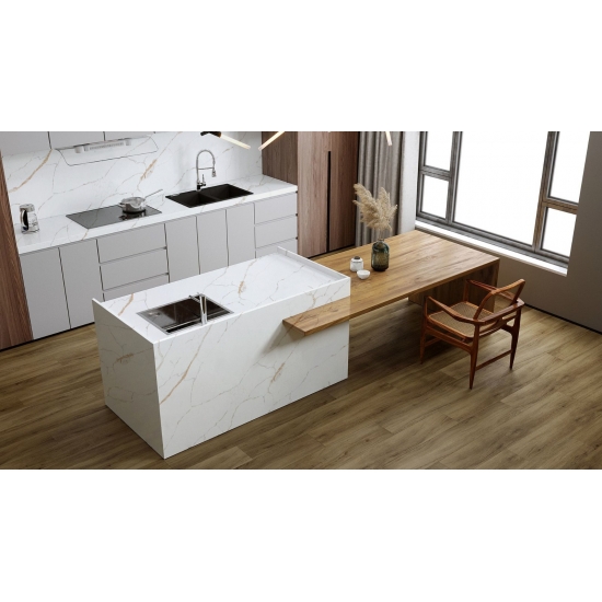 칼라카타 시리즈 쿼츠는 현재 가장 인기 있는 쿼츠 스톤 제품입니다. 정교하고 독특한 칼라카타 쿼츠는 깨끗한 흰색과 대리석 무늬가 돋보이는 아름다운 줄무늬로 감각을 사로잡습니다. 넓고 아름다운 줄무늬 패턴과 고급스러운 질감을 자랑하는 이 쿼츠는 칼라카타 대리석의 자연스러운 외관을 그대로 재현하면서도 대리석 상판의 단점을 모두 해결했습니다. 칼라카타 쿼츠는 내구성이 매우 뛰어나 얼룩과 긁힘에 강하기 때문에 주방 및 욕실 조리대, 계단, 창틀, 맞춤 가구, 실내외 벽면 및 바닥재, 워터젯 패턴 등 다양한 디자인 프로젝트에 실용적인 선택입니다.