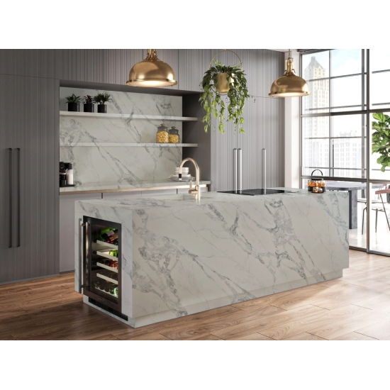 정교하고 독특한 칼라카타 쿼츠는 깨끗한 흰색과 눈길을 사로잡는 대리석 무늬의 줄무늬로 감각을 매료시킵니다. 아름답고 강렬한 넓은 줄무늬 패턴과 고급스러운 촉감을 자랑하는 이 쿼츠는 칼라카타 대리석의 자연스러운 외관을 그대로 재현하면서도 대리석 상판의 단점을 모두 해결했습니다. 칼라카타 쿼츠는 내구성이 매우 뛰어나 얼룩과 긁힘에 강하기 때문에 주방 및 욕실 조리대, 계단, 창틀, 맞춤 가구, 내외부 벽면 및 바닥재, 워터젯 패턴 등 다양한 디자인 프로젝트에 실용적인 선택입니다.