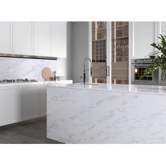 정교하고 독특한 칼라카타 쿼츠는 깨끗한 흰색과 눈길을 사로잡는 대리석 무늬의 줄무늬로 감각을 매료시킵니다. 아름답고 강렬한 넓은 줄무늬 패턴과 고급스러운 촉감을 자랑하는 이 쿼츠는 칼라카타 대리석의 자연스러운 외관을 그대로 재현하면서도 대리석 상판의 단점을 모두 해결했습니다. 칼라카타 쿼츠는 내구성이 매우 뛰어나 얼룩과 긁힘에 강하기 때문에 주방 및 욕실 조리대, 계단, 창틀, 맞춤 가구, 내외부 벽면 및 바닥재, 워터젯 패턴 등 다양한 디자인 프로젝트에 실용적인 선택입니다.
