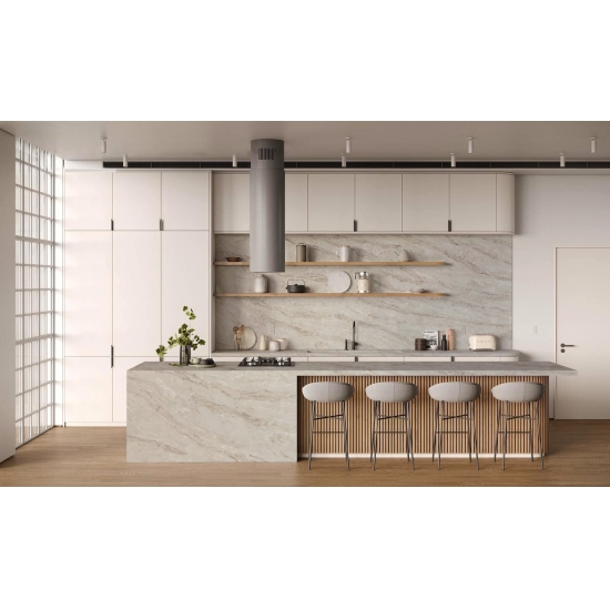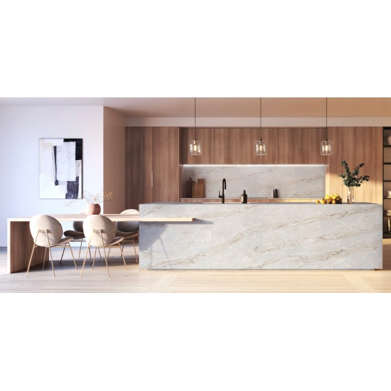 정교하고 독특한 칼라카타 쿼츠는 깨끗한 흰색과 눈길을 사로잡는 대리석 무늬의 줄무늬로 감각을 매료시킵니다. 아름답고 강렬한 넓은 줄무늬 패턴과 고급스러운 촉감을 자랑하는 이 쿼츠는 칼라카타 대리석의 자연스러운 외관을 그대로 재현하면서도 대리석 상판의 단점을 모두 해결했습니다. 칼라카타 쿼츠는 내구성이 매우 뛰어나 얼룩과 긁힘에 강하기 때문에 주방 및 욕실 조리대, 계단, 창틀, 맞춤 가구, 내외부 벽면 및 바닥재, 워터젯 패턴 등 다양한 디자인 프로젝트에 실용적인 선택입니다.