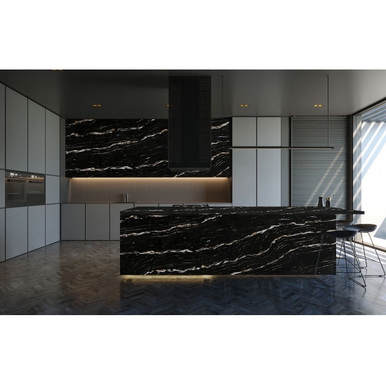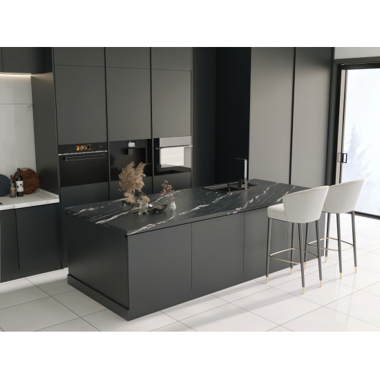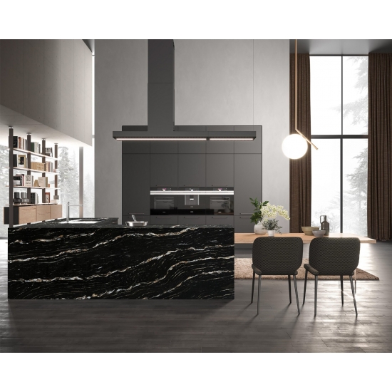 5121 밀란 엑스트라 칼라카타 골드 쿼츠는 깊고 진한 검정색 바탕에 미세하고 반짝이는 입자들이 촘촘히 박혀 있어 대담하고 드라마틱한 외관을 자랑합니다. 어두운 색조와 빛을 반사하는 은은한 반점들이 대비를 이루며 깊이감과 움직임을 만들어내어 세련된 분위기를 연출합니다. 이 쿼츠는 어떤 공간에도 고급스러움을 더하며 존재감을 확실히 드러내도록 디자인되었습니다.