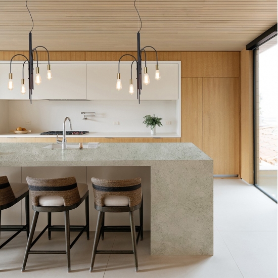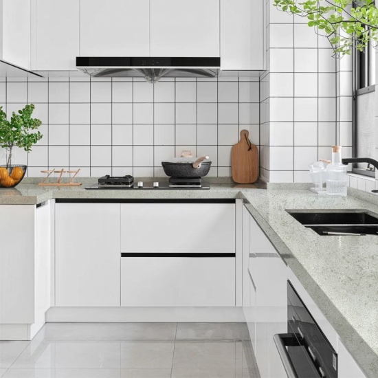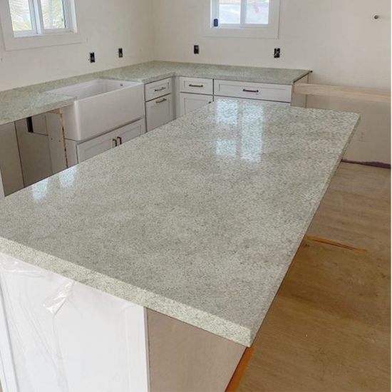 시멘트 화이트 쿼츠 스노우플레이크 텍스처 쿼츠는 특수 처리된 인조석 소재입니다. 무광 마감과 유사하며, 콘크리트 마감 처리는 일반적인 광택 마감과 비교하여 쿼츠의 색상을 약간 변화시킵니다. 이러한 마감은 화강암의 경우 "브러시드" 마감이라고도 합니다.