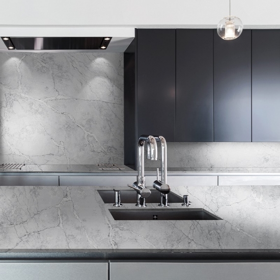 콘크리트 쿼츠는 특수 처리된 인조 석재 쿼츠 소재입니다. 무광 마감과 유사하지만, 콘크리트 마감은 일반적인 광택 마감과 비교했을 때 쿼츠의 색상을 미묘하게 변화시킵니다. 화강암의 경우 이러한 마감을 "브러시드"라고도 합니다.