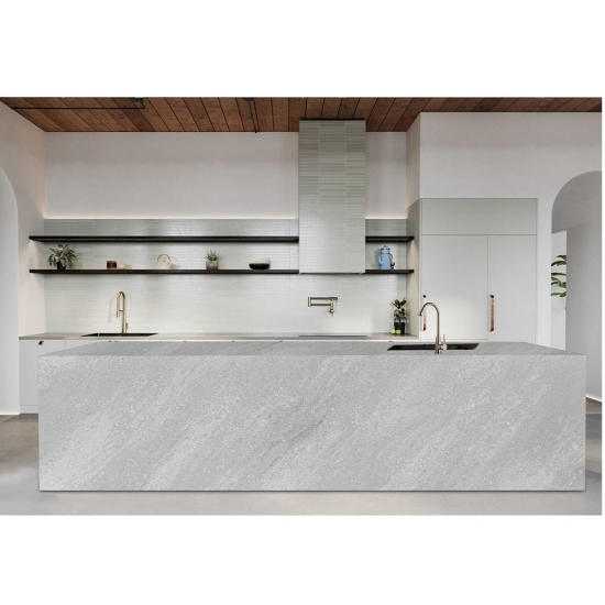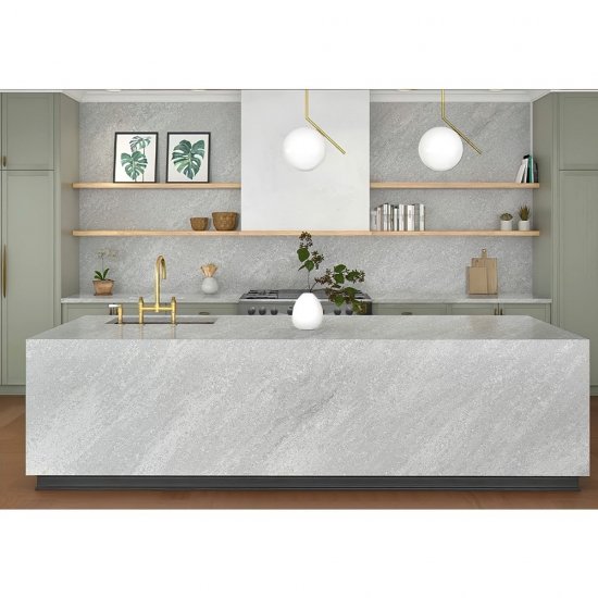 시멘트 화이트 쿼츠 스노우플레이크 텍스처 쿼츠는 특수 처리된 인조석 소재입니다. 무광 마감과 유사하며, 콘크리트 마감 처리는 일반적인 광택 마감과 비교하여 쿼츠의 색상을 약간 변화시킵니다. 이러한 마감은 화강암의 경우 "브러시드" 마감이라고도 합니다.