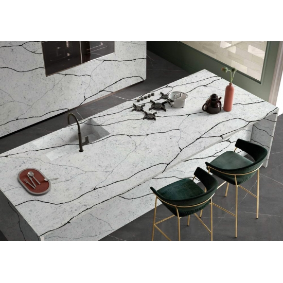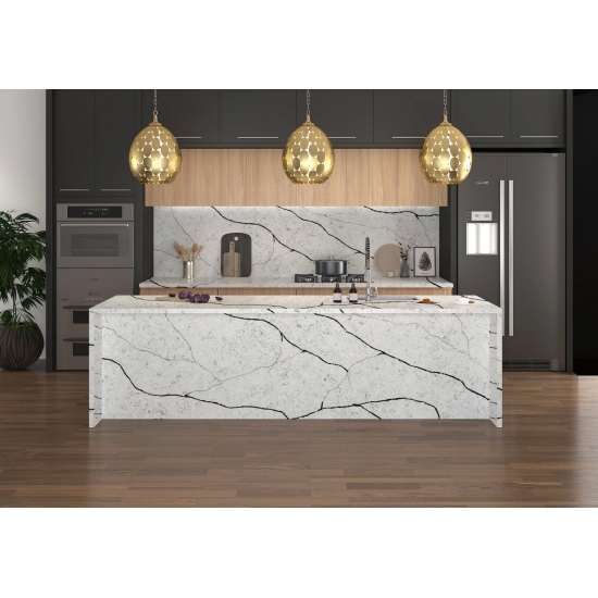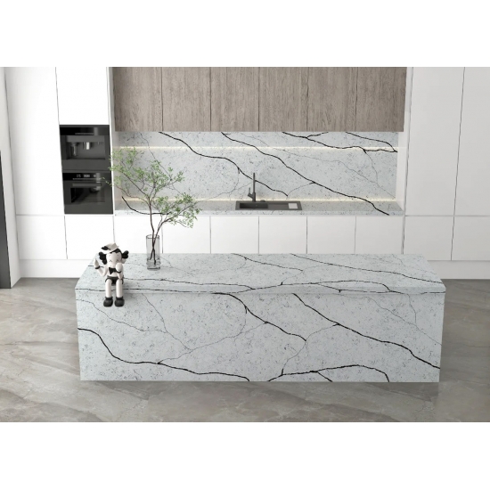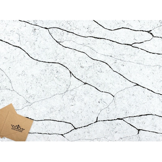 시멘트 화이트 쿼츠 스노우플레이크 텍스처 쿼츠는 특수 처리된 인조석 소재입니다. 무광 마감과 유사하며, 콘크리트 마감 처리는 일반적인 광택 마감과 비교하여 쿼츠의 색상을 약간 변화시킵니다. 이러한 마감은 화강암의 경우 "브러시드" 마감이라고도 합니다.